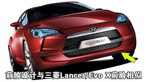 現(xiàn)代Veloster coupe概念采用的是現(xiàn)代Theta 2.0升直列四缸發(fā)動(dòng)機(jī),通過五前速自動(dòng)變速箱將動(dòng)力傳遞到前輪。雙車門設(shè)計(jì),前臉設(shè)計(jì)讓我們想起了最新的三菱Lancer/Evo X前臉。