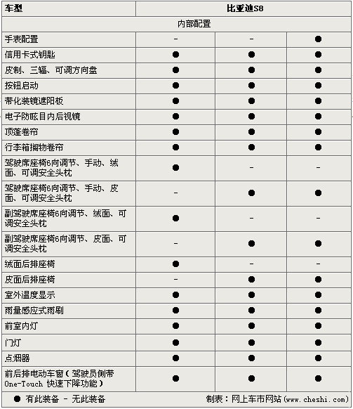 在空調(diào)、音像設(shè)備方面,S8配置了自動(dòng)空調(diào)系統(tǒng)、DVD娛樂系統(tǒng)及USB接口等,同時(shí)高配的豪華型擁有藍(lán)牙通信系統(tǒng)、GPS導(dǎo)航及負(fù)離子發(fā)生器等高端配置。 說了這么多,消費(fèi)者更關(guān)心的應(yīng)該是這款硬頂敞篷跑車的價(jià)格了,據(jù)內(nèi)部人士透露它的價(jià)格將在20萬元以內(nèi)。這樣的價(jià)格對(duì)于一款自主品牌的車似乎貴了一些,比亞迪是否會(huì)給我們帶來驚喜呢?讓我們拭目以待!