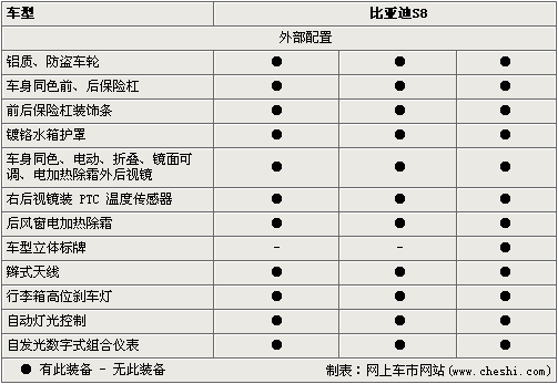 S8外形設(shè)計(jì)時(shí)尚動(dòng)感,兼具轎跑車特性。經(jīng)過比亞迪汽車工程研究院的精心打造,S8造型的前格柵、前組合燈和發(fā)動(dòng)機(jī)蓋吸取不同的設(shè)計(jì)元素,完美的有機(jī)整合在一起;車尾線條簡(jiǎn)潔而有力。S8整個(gè)造型充分考慮了雙門轎跑車和敞篷車的特點(diǎn),集動(dòng)感、和諧與典雅于一起。無門柱設(shè)計(jì)使整車線條更顯流暢,更顯S8典雅的氣質(zhì)。