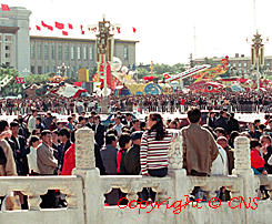 參加50年國慶游行的大型彩車擺放在天安門廣場上,十月二日數(shù)以萬計的游人從北京各處涌向這里,一睹節(jié)日廣場的風采。