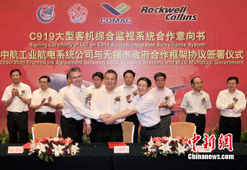 中新網(wǎng)無錫7月8日電(記者 孫權(quán))中國商用飛機有限責任公司、中航工業(yè)雷達與電子設備研究院和美國羅克韋爾柯林斯公司三方今日在無錫“握手”,確定國產(chǎn)C919大型客機綜合監(jiān)視系統(tǒng)的研制生產(chǎn)項目落戶無錫市濱湖區(qū)。幾年后,裝備“無錫造”綜合監(jiān)視系統(tǒng)的C919大型客機,將翱翔在中國的藍天,并飛行在世界各地。