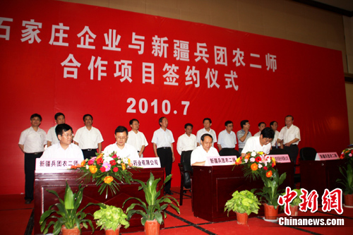 27日至30日,黃金忠一行揮師河北省會石家莊,在河北會堂舉辦首次大型推介會,并考察了石家莊市的神威藥業(yè)、常山紡織集團(tuán)和偉天實業(yè)。盡管官方目前尚未公布簽約數(shù)據(jù),但已知農(nóng)二師和石家莊市三家企業(yè)“結(jié)緣”,順利簽訂了合作協(xié)議。根據(jù)協(xié)議,常山紡織集團(tuán)將在農(nóng)二師開展棉花資源基地建設(shè)和29團(tuán)棉紡企業(yè)的升級、擴(kuò)建,神威藥業(yè)在該師建設(shè)中草藥基地并建立長期戰(zhàn)略合作關(guān)系,而河北偉天實業(yè)則與農(nóng)二師合作建設(shè)電廠。
