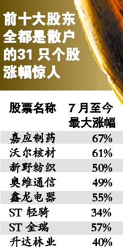 權(quán)威統(tǒng)計數(shù)據(jù)顯示,能夠在A股上市公司前十大流通股股東中“露臉”的個人投資者超過5000人。從中報來看,31只股票的前十大股東都是個人投資者,并且在7月份以來其整體表現(xiàn)十分出色,漲幅超過20%的就達22只。