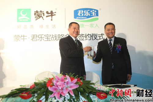中新網(wǎng)11月22日電 蒙牛乳業(yè)集團和君樂寶乳業(yè)22日在北京聯(lián)合召開戰(zhàn)略合作新聞發(fā)布會,蒙牛將投資4.692億元持有君樂寶乳業(yè)51%股權(quán),成為君樂寶的最大股東。此次合作將成為中國乳業(yè)近兩年來影響最大的一次合作,預(yù)示著中國乳業(yè)聯(lián)合、重組、兼并收購“浪潮”的來臨。