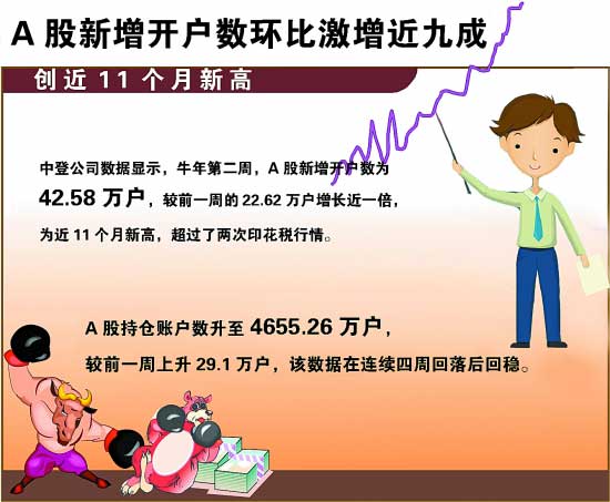 自2008年10月以來的這波反彈行情,形成了較大的財富效應(yīng),由于指數(shù)權(quán)重股的滯漲,上證指數(shù)至今僅累計上漲40%左右,但相當(dāng)多個股已經(jīng)翻倍。在市場賺錢效應(yīng)吸引下,股民入市熱情被激發(fā),中登公司最新公布的數(shù)據(jù)顯示,牛年第二周,A股新增開戶數(shù)為42.58萬戶,較前一周的22.62萬戶增長近一倍,為近11個月新高,超過了兩次印花稅行情。