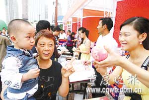 昨天的朝天門廣場,微風(fēng)伴著細(xì)雨,氣溫適宜,不少市民前來玩耍。廣場中央,是一個用蘋果搭成的展覽塔,廣場一側(cè),是昭通市政府的蘋果展銷臺,堆積如山的蘋果吸引了廣大重慶市民,負(fù)責(zé)推銷的工作人員不停地給蘋果削皮,削好的蘋果很快就被市民吃了個精光。