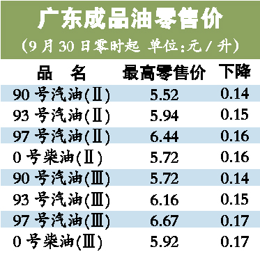 國(guó)家發(fā)改委決定從今天零時(shí)起降低成品油價(jià),汽、柴油每噸降低190元。昨日,廣東省物價(jià)局公布了新的成品油最高銷售價(jià)格。國(guó)Ⅱ標(biāo)準(zhǔn)90號(hào)汽油每升下調(diào)0.14元,93號(hào)汽油每升下調(diào)0.15元,97號(hào)汽油每升下調(diào)0.16元,0號(hào)柴油每升下調(diào)0.16元;國(guó)Ⅲ標(biāo)準(zhǔn)90號(hào)汽油每升下調(diào)0.14元,93號(hào)汽油每升下調(diào)0.15元,97號(hào)汽油每升下調(diào)0.17元,0號(hào)柴油每升下調(diào)0.17元。(記者葉平生 通訊員岳佳綜)