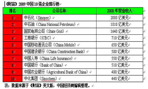 美國(guó)《財(cái)富》雜志英文版10月13日公布了中國(guó)10強(qiáng)公司排行榜,中石化以2080億美元銷售收入(2008年數(shù)據(jù))名列第一位,中石油排名第二,2008年銷售收入為1810億美元。排在第三位的是國(guó)家電網(wǎng)公司,2008年?duì)I業(yè)收入為1640億美元。