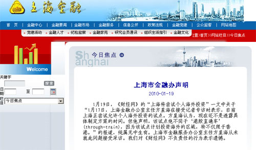 據(jù)上海金融辦網(wǎng)站刊出的聲明指出,《財經(jīng)網(wǎng)》有關(guān)“上海將嘗試個人海外投資”的報道,純屬“無中生有”,上海市金融服務(wù)辦公室主任方星海,從未就此問題接受采訪,對《財經(jīng)網(wǎng)》不負責(zé)任的行為,表示遺憾。