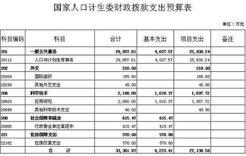 本表按支出功能分類科目編制,反映國家人口計生委年度部門預(yù)算中財政撥款支出的總體情況,按照基本支出和項目支出劃分。