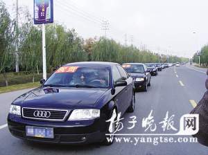記者在現(xiàn)場看到,這支由28輛名車組成的豪華車隊(duì),包括3輛寶馬、11輛奧迪、6輛豐田,以及別克、本田、帕薩特等高檔轎車。約9時10分左右,這支豪華車隊(duì)開始緩緩開動起來,最前面由一輛別克轎車“開道”,緊跟在后面的是一輛奔馳面包,車中坐著的就是當(dāng)日車隊(duì)接送的“主角”——張良憲花費(fèi)160萬元從外地買來的藏獒。這輛奔馳面包車前扎著大紅的綢花,車的側(cè)面掛著一條紅色條幅“中國名獒160萬元落戶宿遷張良憲藏獒繁育基地”。后面的車綿延跟進(jìn),每輛車都打著雙跳,緩緩前進(jìn),速度在20碼左右。