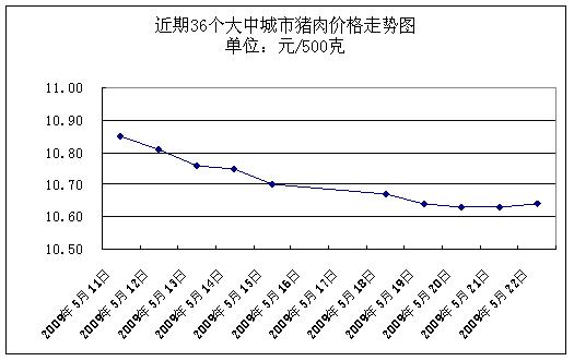 中新網(wǎng)5月25日電 據(jù)國家發(fā)改委網(wǎng)站消息,據(jù)國家發(fā)展改革委價格監(jiān)測中心監(jiān)測,上周(2009.5.18-2009.5.22,下同)36個大中城市集市、超市豬肉(精瘦肉)平均零售價格每500克為10.64元,與前一周(2009.5.11-2009.5.15,下同)相比下降1.21%。