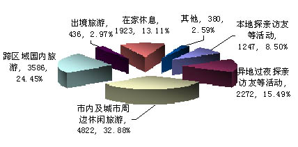 調(diào)查結(jié)果顯示,57.33%的受訪者計(jì)劃在國(guó)內(nèi)旅游,其中:32.88%受訪者有意在市內(nèi)及城市周邊休閑旅游,24.45%的受訪者有意跨區(qū)域國(guó)內(nèi)旅游;2.97%的受訪者計(jì)劃出境旅游;23.99%的受訪者有意探親訪友,其中:15.49%的受訪者計(jì)劃異地過(guò)夜探親訪友;13.11%的受訪者計(jì)劃在家休息。