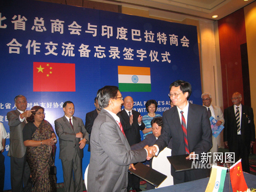 中新網(wǎng)武漢7月24日電 (艾啟平 劉俞君)湖北—印度經(jīng)貿(mào)合作洽談會24日在武漢舉行。洽談會上,湖北省總商會與印度巴拉特商會簽署了合作交流《備忘錄》,期望搭建起湖北與印度企業(yè)界交流合作平臺。