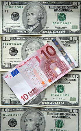 圖為歐元(上)和美元紙幣。新華社/法新
