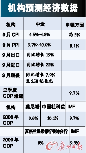 多家機構已提前發(fā)布了他們對CPI和PPI的預測數據。此次,各家機構高度一致地得出了CPI和PPI有望雙降的結論。不過,在“保增長”成為宏觀調控的首要目標的背景下, GDP增速回落已經成為不能回避的問題,多家機構紛紛預測,三季度經濟增速繼續(xù)延續(xù)今年以來的回落態(tài)勢。