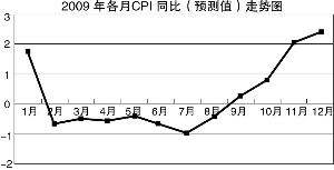根據(jù)以上因素,我們預(yù)測(cè)2009年CPI走勢(shì)總體上呈現(xiàn)“兩頭高、中間低”的走勢(shì),全年CPI同比為0.3%,1-4各季度CPI同比分別為0.2%、-0.6%、-0.4%和1.8%。具體的預(yù)測(cè)方法,主要是將CPI同比劃分為新增因素和翹尾因素兩部分,由于后者基本是確定的,而只要對(duì)前者進(jìn)行預(yù)測(cè)。
