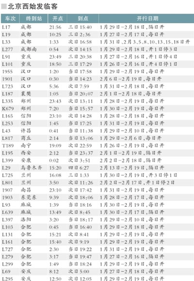 節(jié)后加開(kāi)的55趟臨客中,北京西站有35趟,北京站有16趟,北京北站有4趟。這些臨客中開(kāi)往合肥方向的臨客有7趟,哈爾濱方向的臨客有5趟(包括動(dòng)車組D29、Z115、T71)。以上臨客最早的從大年初一開(kāi)行,最晚的要到2月19日。旅客可參考車站公告了解具體開(kāi)行情況。