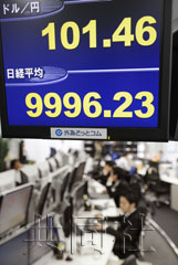 電子牌顯示日經(jīng)指數(shù)跌破1萬點關(guān)口,美元兌日元比價升至101上方。7日上午9點18分?jǐn)z于東京東新橋的外匯.COM。(共同社)