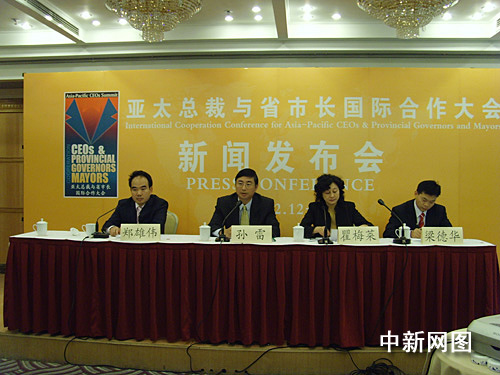 中新網(wǎng)11月28日電 今日下午,亞太總裁協(xié)會(huì)與廣州市人民政府聯(lián)合在京宣布:第三屆亞太總裁與省市長國際合作大會(huì)將于今年12月12日-14日在中國第三大經(jīng)濟(jì)中心城市廣州市隆重舉辦。亞太總裁協(xié)會(huì)全球執(zhí)行主席鄭雄偉及第三屆亞太總裁與省市長國際合作大會(huì)組委會(huì)辦公室主任、廣州市對(duì)外貿(mào)易經(jīng)濟(jì)合作局副局長孫雷等出席了當(dāng)天發(fā)布會(huì)并接受記者提問。