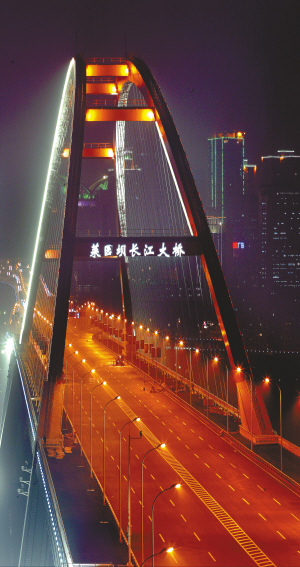 菜園壩長(zhǎng)江大橋2003年12月28日動(dòng)工,起于兩路口原富安百貨大廈前面的中山三路,經(jīng)建新坡、菜園壩外灘商城、長(zhǎng)濱路及珊瑚公園后跨越長(zhǎng)江,最后到達(dá)終點(diǎn)大石路立交,路線(xiàn)全長(zhǎng)4公里。其中主橋全長(zhǎng)1866米,為兩層設(shè)計(jì),上面為雙向6車(chē)道;下面為在建的輕軌3號(hào)線(xiàn)通道,是改善主城區(qū)南北大通道交通的關(guān)鍵性工程。
