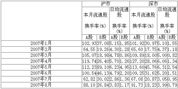 表6 2007年我國(guó)股市換手率情況