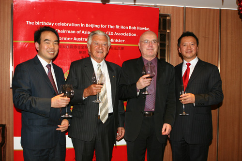 中新網(wǎng)12月10日電 12月9日晚,著名國際經(jīng)濟組織亞太總裁協(xié)會在典雅的北京中奧馬哥孛羅大酒店舉辦了一場別開生面的生日慶典,慶祝享有“APEC之父”美譽的澳大利亞前總理鮑勃•霍克先生的生日。