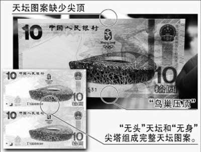 此次發(fā)行的奧運紀念鈔正面主景圖案為北京2008年奧林匹克運動會主會場——國家體育場建筑圖案,其上方為第29屆奧林匹克運動會會徽圖案,背景輔以世界文化遺產——天壇剪影輪廓示意圖。但一些收藏者發(fā)現(xiàn),天壇的壇頂出現(xiàn)在“鳥巢”圖案的下方。