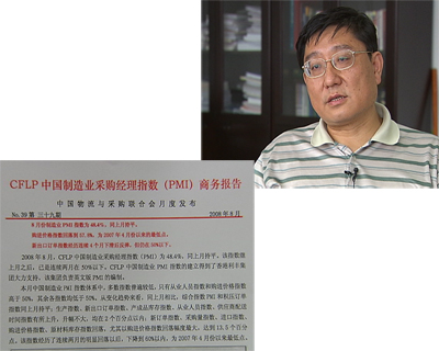 蔡進:“你看8月份的購進價格指數(shù)是57.8%,比上個月大幅回落13.5個百分點,這個是我們有記錄以來最大的一個降幅。就任何指數(shù)以前都沒有這么降過,它反應(yīng)什么?應(yīng)該說反應(yīng)我們國家這個宏觀調(diào)控的政策的措施出臺以后對價格的控制是取得了明顯的效果,價格的增長幅度的話,很可能會在今后幾個月會有明顯的回落!