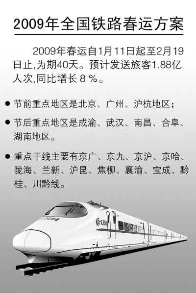 鐵道部8日宣布,2009年全國鐵路春運(yùn)自1月11日起至2月19日止,為期40天,其中春節(jié)前15天,節(jié)后25天。
