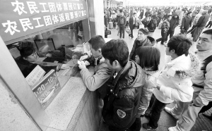 晨報(bào)訊(記者 張碩)昨天,北京站、北京西站開(kāi)始銷(xiāo)售農(nóng)民工火車(chē)票,并且接受農(nóng)民工團(tuán)體票的預(yù)訂。這次還開(kāi)設(shè)了農(nóng)民工返程團(tuán)體票的預(yù)訂和發(fā)售,大大方便了在京農(nóng)民工。據(jù)悉,1月6日至15日為民工流高峰。