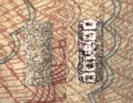 第三種偽造安全線(xiàn)是使用雙層紙張,在紙張夾層中放實(shí)物線(xiàn),線(xiàn)與紙張結(jié)合較差,線(xiàn)表面印刷磁性油墨。
