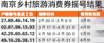 此次發(fā)放活動(dòng)的旅游券消費(fèi)時(shí)間為3月-6月,不過鄉(xiāng)村旅游消費(fèi)券標(biāo)有使用月份,按月使用,有效期為當(dāng)月。本次搖號(hào)方式,根據(jù)江南八區(qū)居民戶口簿編號(hào)的最后兩位數(shù)字進(jìn)行搖號(hào),分別搖出3、4、5、6月份鄉(xiāng)村旅游消費(fèi)券的發(fā)放戶口簿號(hào)碼,每個(gè)月為一組,每組為5個(gè)號(hào)碼。
