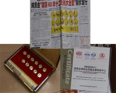 最近,北京多家知名媒體刊登大幅廣告,以著名書(shū)畫(huà)大師范曾的名義推銷(xiāo)純黃金“建國(guó)60年十二生肖大全套”,廣告中不僅聲稱(chēng)耗用了68.6克純黃金鑄造了12枚純金生肖和巨幅畫(huà)卷,同時(shí),還宣稱(chēng)這是中國(guó)金幣史上第一套“建國(guó)十二生肖”的大全套。