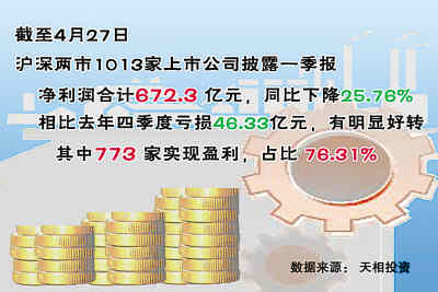 值得欣慰的是,這一加速下滑趨勢有望在今年一季度得到緩解。截至4月27日,兩市共1013家上市公司披露一季報(bào),其中773家公司今年一季度實(shí)現(xiàn)盈利,占比76.31%。已披露一季報(bào)公司今年一季度凈利潤合計(jì)672.3億元,雖然同比仍然下降了25.76%,但和去年四季度的虧損46.33億元相比,已有明顯好轉(zhuǎn)。