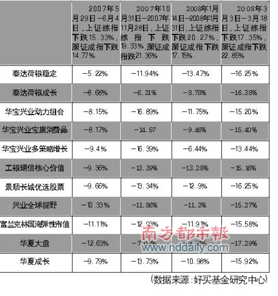 3月份以來(lái),受到股市拖累的股票型基金,凈值下跌最少的也有10%,最多損失超過(guò)24%.然而同樣是凈值縮水,今年以來(lái)績(jī)優(yōu)與績(jī)差基金之間的差距居然高達(dá)30%,尋找抗跌的基金已經(jīng)成為今年基金投資的一個(gè)主要命題。好買基金研究中心樂(lè)嘉慶指出,從去年5月底至今,股市共經(jīng)歷了4個(gè)跌幅超過(guò)15%的階段。在4個(gè)階段中比較抗跌的基金表現(xiàn)出兩大特點(diǎn),一是行業(yè)投資比較均衡的基金,另一個(gè)則是規(guī)模適中,倉(cāng)位調(diào)整迅速的基金。