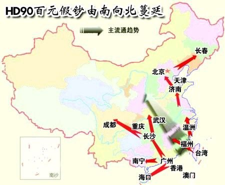 1月8日,央行就此事在北京召開(kāi)記者招待會(huì),央行貨幣金銀局局長(zhǎng)葉英男澄清了HD90版假幣“高仿真”的傳言。部分城市的警方已經(jīng)就假幣事件立案調(diào)查。然而,透過(guò)沸沸揚(yáng)揚(yáng)的假幣風(fēng)波,人們不禁要問(wèn),如此大規(guī)模的假幣事件頻發(fā),背后是怎樣一只無(wú)形的黑手?一條由南向北、自東向西的假幣蔓延路徑,漸漸浮出了水面……