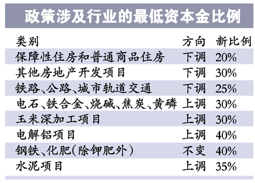 根據(jù)此次調(diào)整,大部分行業(yè)的最低資本金比例下調(diào)了5~10個(gè)百分點(diǎn),其中保障性住房和普通商品住房項(xiàng)目下調(diào)15個(gè)百分點(diǎn),大大超出此前的預(yù)期,而鐵路、公路等交通和大型基建項(xiàng)目也是此次資本金比例調(diào)整的主要受益對(duì)象。高污染、高能耗和產(chǎn)能過(guò)剩的項(xiàng)目則被上調(diào)最低資本金比例。