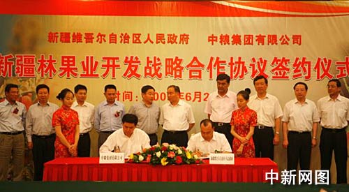 中新網(wǎng)烏魯木齊6月24日電 (記者 汪金生) 新疆維吾爾自治區(qū)政府24日與中糧集團(tuán)簽署《新疆林果業(yè)開發(fā)戰(zhàn)略合作協(xié)議》,這次簽約是中糧集團(tuán)與新疆在番茄、制糖、油脂、飲料等業(yè)務(wù)開展合作基礎(chǔ)上的又一項(xiàng)重要合作,拉開了中糧集團(tuán)全面進(jìn)軍新疆林果業(yè)開發(fā)的序幕,奠定了新疆林果業(yè)產(chǎn)業(yè)升級(jí)、做大做強(qiáng)的基礎(chǔ)。