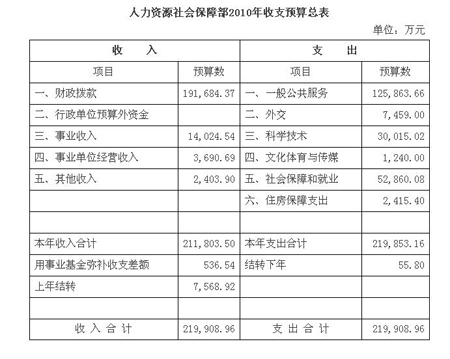 據(jù)人社部網(wǎng)站消息顯示,根據(jù)《財政部關(guān)于批復(fù)人力資源和社會保障部2010年部門預(yù)算的通知》(財預(yù)[2010]205號),人社部2010年預(yù)算情況如下: