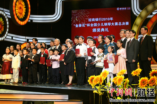 活動(dòng)現(xiàn)場(chǎng),招商銀行和中國(guó)兒童少年基金會(huì)合作成立了金葵花兒童成長(zhǎng)基金鋼琴藝術(shù)計(jì)劃,招商銀行丁行長(zhǎng)和兒童基金會(huì)領(lǐng)導(dǎo)共同舉行了揭牌儀式。此計(jì)劃將資助有鋼琴天賦卻家庭困難的兒童,以實(shí)現(xiàn)他們的鋼琴夢(mèng)想;饡(huì)在現(xiàn)場(chǎng)將第一筆基金頒發(fā)給2008年參賽的盲人琴童來(lái)佳俊,和本屆參賽的琴童盧星宇,以鼓勵(lì)他們?cè)阡撉俚缆飞显阶咴竭h(yuǎn)。 (中新網(wǎng)財(cái)經(jīng)頻道)