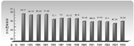 從國(guó)際口徑統(tǒng)計(jì)結(jié)果看,我國(guó)勞動(dòng)報(bào)酬占比的基本走勢(shì)和國(guó)內(nèi)口徑統(tǒng)計(jì)相一致,但差距縮小。從1992年到2005年,除了2003年、2004年低于50%外,其他年份勞動(dòng)報(bào)酬占比均在50%以上。
