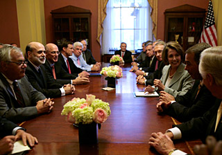 在公布金融救援計(jì)劃前,美國(guó)財(cái)政部長(zhǎng)保爾森、美國(guó)聯(lián)邦儲(chǔ)備委員會(huì)主席伯南克和布什進(jìn)行了緊急磋商;保爾森等官員隨后又拜會(huì)多位資深議員,爭(zhēng)取到了他們的支持。