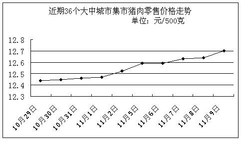 中新網(wǎng)11月12日電 國(guó)家發(fā)改委網(wǎng)站發(fā)布消息稱,據(jù)國(guó)家發(fā)展改革委價(jià)格監(jiān)測(cè)中心監(jiān)測(cè),上周(11.5-11.9,下同)全國(guó)36個(gè)大中城市豬肉(精瘦肉)集市平均零售價(jià)格每500克為12.63元,比上期(10.29-11.2,下同)上漲1.28%。