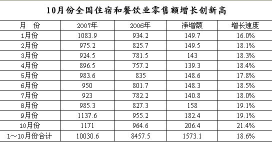 今年1-10月份,全國住宿與餐飲業(yè)零售額累計實現(xiàn)10030.6億元,同比增長18.6%,比去年同期增幅高出2.4個百分點,占社會消費品零售總額的13.9%,拉動社會消費品零售總額增長2.5個百分點,對社會消費品零售總額的增長貢獻率為15.7%。