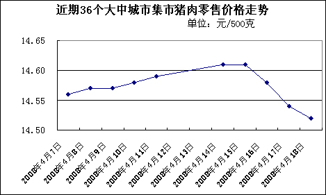 中新網(wǎng)4月21日電 中國(guó)國(guó)家發(fā)改委網(wǎng)站消息,據(jù)發(fā)改委價(jià)格監(jiān)測(cè)中心監(jiān)測(cè)顯示,上周(2008.4.14-2008.4.18,下同)中國(guó)36個(gè)大中城市集市豬肉(精瘦肉)平均零售價(jià)格每500克為14.57元,與前一周(2008.4.7-2008.4.11,下同)持平。