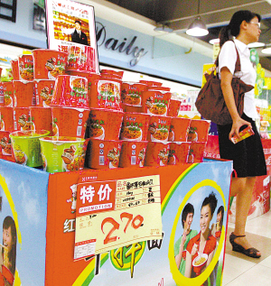 某超市一桶裝方便面品牌打出降價(jià)招牌(資料圖片)記者 畢克勤 攝