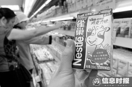 在家樂福超市萬國(guó)廣場(chǎng)店,記者看到光明純牛奶250毫升裝悄然回歸賣場(chǎng);在吉之島超市天河城店,記者看到,昨日還未貼上綠簽的雀巢巧克力味和草莓味的配制型含乳飲料,昨日悄然換新裝。其生產(chǎn)日期標(biāo)注為“2008年6月6日”,早于9月14日這一“分水嶺”。同時(shí),記者在7-11便利店天河南店也看到了雀巢這兩款配制型含乳飲料重新擺上貨架售賣。