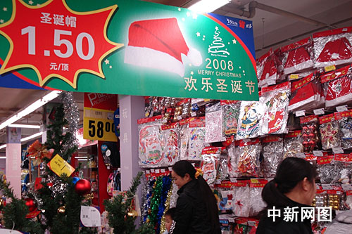在杭州市下城區(qū)的樂購超市,圣誕專柜打出醒目的廣告,一頂圣誕帽只需1.5元,好又多鳳起店更是甩出一元特價圣誕帽,歐尚、世紀聯(lián)華等超市也低價銷售。一位正在挑選圣誕帽的顧客說:“一斤白菜也就一塊多,今年圣誕飾品在價格方面便宜了不少。以往的折扣價都在節(jié)日過后才有,現(xiàn)在離圣誕節(jié)還有十天,就已經(jīng)打折了!