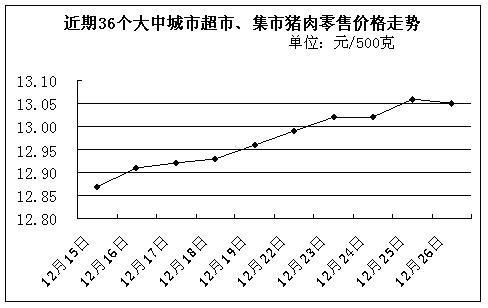 中新網(wǎng)12月30日電 據(jù)國家發(fā)改委網(wǎng)站消息,據(jù)國家發(fā)展改革委價格監(jiān)測中心監(jiān)測,上周(12月22日-12月26日)36個大中城市超市、集市豬肉(精瘦肉)平均零售價格每500克為13.03元,比前一周(12月15日-12月19日,下同)上漲0.85%。